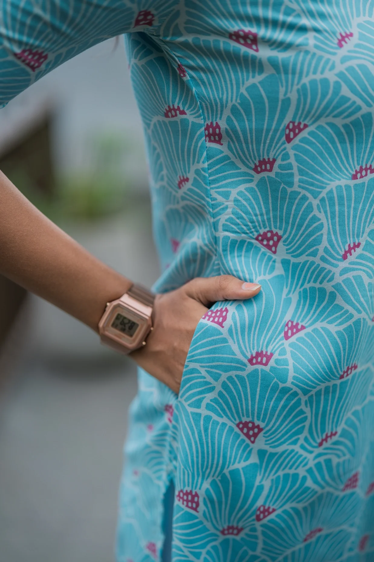 - Design: All-over floral motif with side slits