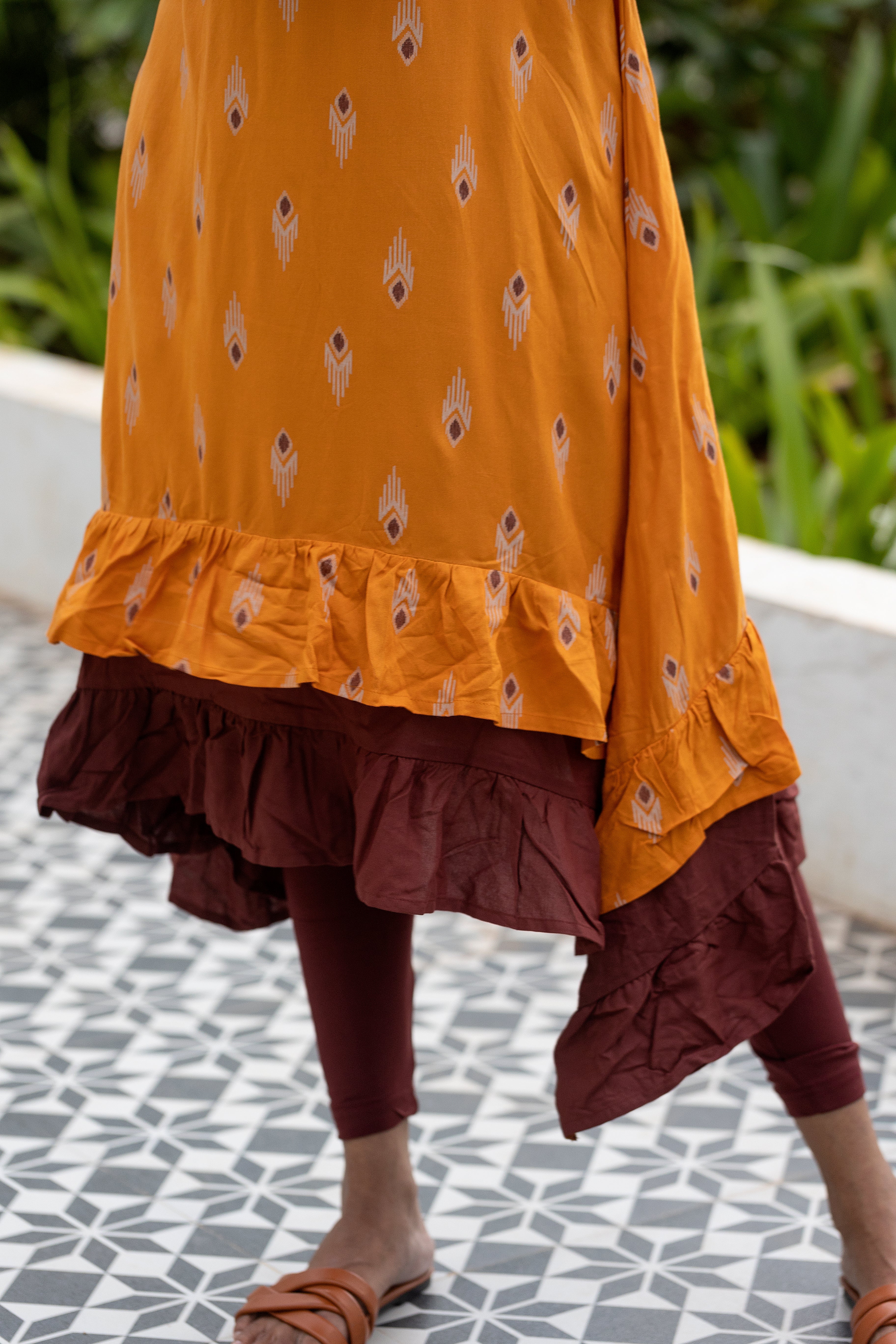Infinite Ikat kurti has boat neck with three-quarter sleeves and with frill detailing.
