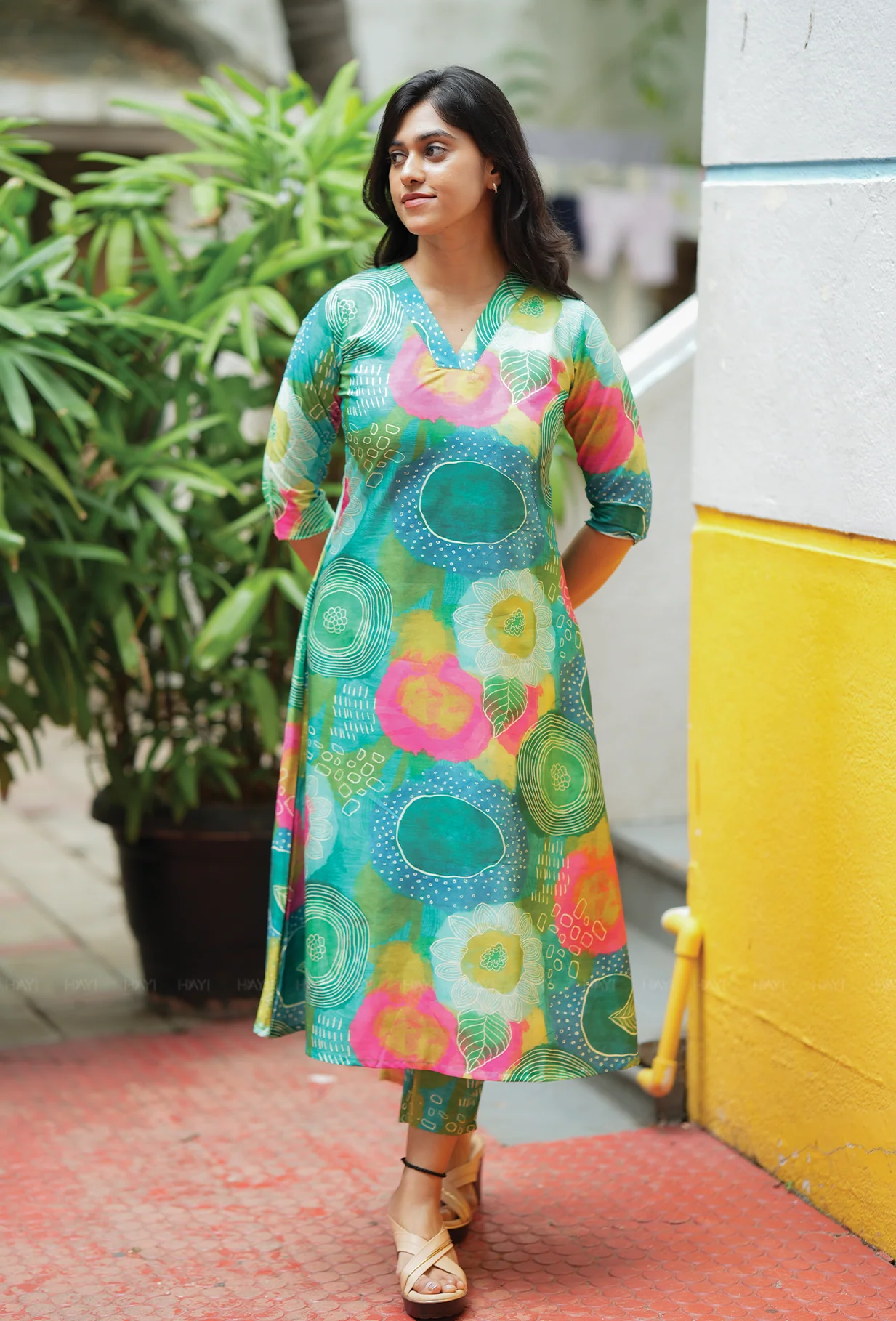 • Print: Bold abstract floral print in hues of pink, green, yellow, and white set against a refreshing green base